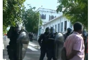 En guise de réponse ce sont quelques dizaines de manblo qui chargent les travailleurs sanblé pacifiquement devant le portail du conseil général en bousculant et molestant plusieurs de nos camarades après avoir utilisé des gaz lacrymogènes lancés en pleines figures.